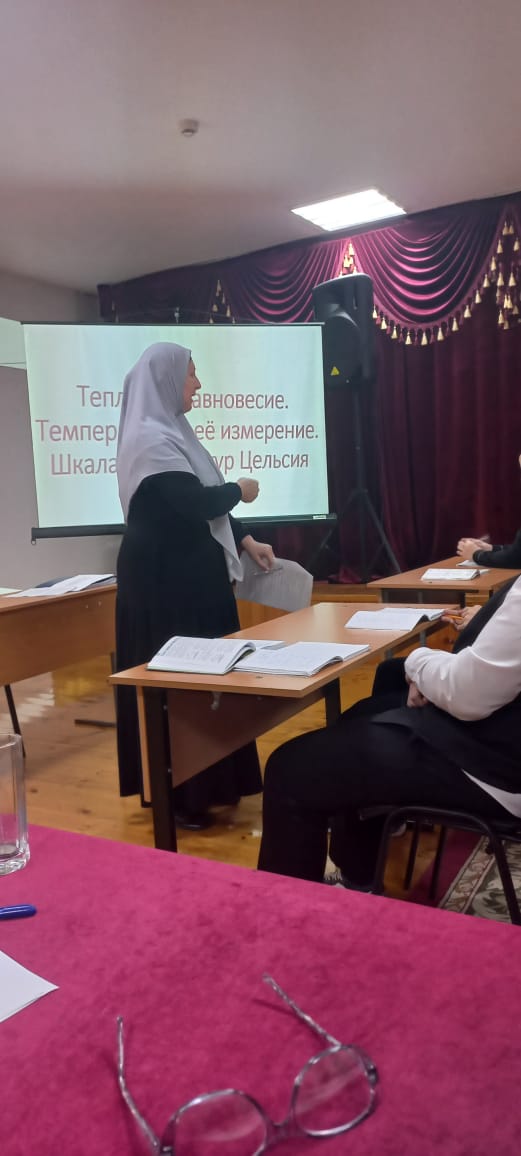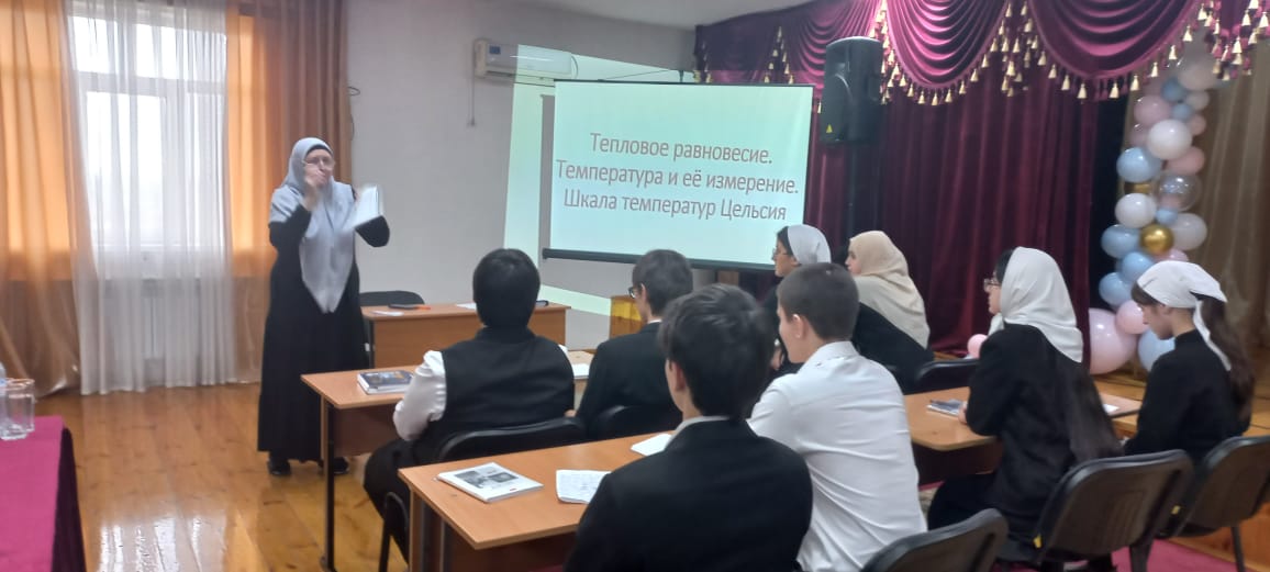 Урок прошел по теме « Тепловое равновесие. Температура и ее измерение, Шкала температур Цельсия». В ходе урока учитель физнки Вахабова Элима Асламбековна использовала различные виды термометров, дети проводили опыты, научились/ переводить значения температуры между шкалой Цельсия и абсолютной шкалой Обучаемые устанавливали связь (тепловой вонтарт-тепловое равновесне равенство температур), учились веденню культурного диалога.